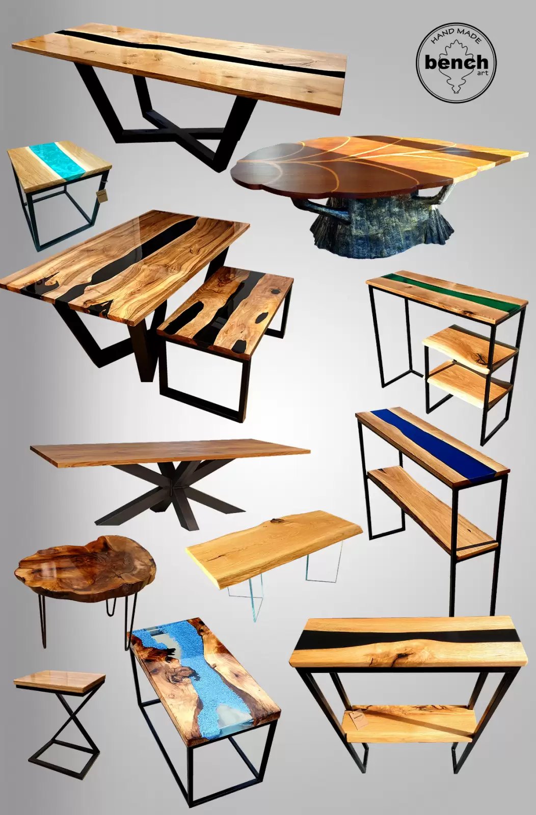 Łączymy różne style, metody wykonania. Łączymy drewno ze stalą, żywicami epoksydowymi, szkłem, fornirami kamiennymi, płytami mineralno – akrylowymi.